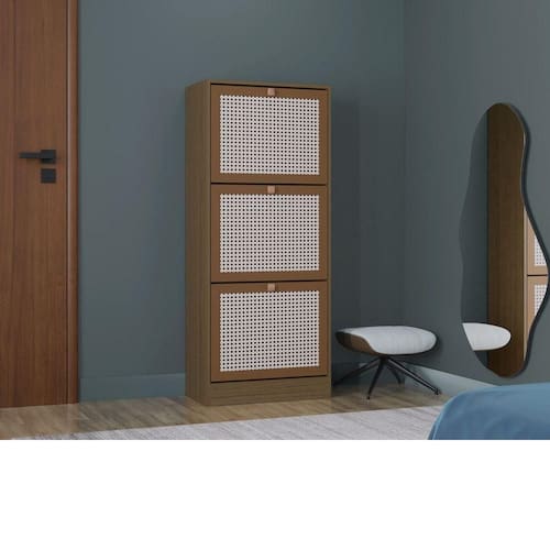 Caracteristicas: Ideal para quarto, closet ou lavanderia. Design vertical compacto para maximizar o espaco. 3 portas para armazenar sapatos de forma organizada. Montagem facil e rapida. Cores modernas e criativas para transformar seu ambiente Amplo Espaco de Armazenamento: Com 3 portas, voce tera espaco de sobra para organizar seus sapatos Estilo Unico: Design exclusivo com pintura 3D que imita a palha indiana Durabilidade: Material resistente que garante longa durabilidade