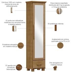 Totalmente fabricada em madeira maciça, essa sapateira combina um espelho integrado, perfeito para checar o look completo, ao passo que as prateleiras e a gaveta resumem o inteligente armazenamento para acessórios ou itens mais pessoais. Ideal para halls de entrada, suítes compactas ou qualquer espaço que mereça uma solução sofisticada, essa sapateira com espelho prova que organização e estilo podem caminhar juntos.