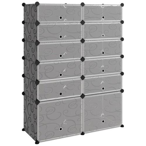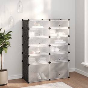 - Cor: preto- - Forma: retangular- - Material: plástico sintético- - Interno/externo: somente interno- - Número de portas: 12- - Tampa incluída: Não- - Sala: corredor- - Capacidade: 16 pares de sapatos- - Peso máximo: 22 libras- - Dimensões: 14,6 x 37 x 49,2 polegadas (L x C x A) - - Peso: 19,51 libras- - Escada: Não- - Marca: vidaXL- - A entrega contém: 16 x Painel (L) - - Montagem necessária: Sim- - SKU: 340565- - EAN: 8720286849682-