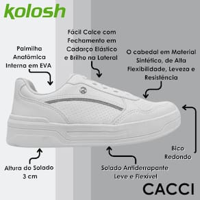 O Tênis Kolosh Casual é versátil e leve, ideal para suas atividades do dia a dia. Com calce fácil proporcionado pelo elástico que substitui os cadarços de amarrar, o modelo otimiza seu tempo. Além disso, é feito em material sintético de extrema qualidade, que garante durabilidade, conforto e um visual moderno e fácil de combinar. O design do tênis é minimalista e atemporal, com sola caixa de aproximadamente 3cm de altura que garante conforto e estabilidade, e detalhes lineares que trazem um toque de charme.