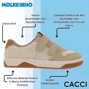 O solado emborrachado com frisos garante excelente aderência ao solo, evitando escorregões e trazendo mais estabilidade durante as brincadeiras e caminhadas. Funcional, estiloso e pensado para o conforto dos meninos, o Sapatênis Molekinho é aquele companheiro ideal para os dias cheios de energia.