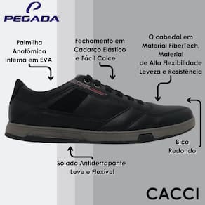 Esse sapatènis é feito com a microfibra especial da Pegada: Fibertech, material tecnológico de alta flexibilidade, leveza e resistência, que é de qualidade superior aos demais sintéticos. A durabilidade e a resistência desse material é tanta que a microfibra é apontada como uma das matérias primas mais apropriadas para produção de calçados de segurança. Outra característica do material é a sua capacidade de transpiração para eliminar o suor do pé. O forro é em tecido espumado, que garante conforto e também auxilia nessa questão da absorção do suor, características necessárias para manter o pé seco e arejado. A palmilha é feita de material macio e confortável. Já o solado é antiderrapante e de alta flexibilidade, oferecendo a segurança e a versatilidade ideal ao calçado do dia a dia. Além de tudo isso o modelo ainda possui o sistema Calce Fácil, com zíper ma lateral e cadarço em elástico que não precisa ser amarrado e é super prático de calçar