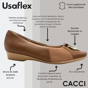 Sinta o conforto da Usaflex com a praticidade dessa Sapatilha. Esse modelo com design sofisticado é confeccionado em couro e tecido favo, um conforto especial para quem tem joanetes, se moldando perfeitamente ao pé. Ela conta com a tecnologia Bem-Estar, que consiste em uma palmilha anatômica com uma espuma super confortável. O forro é feito em tecido resistente, macio e muito sedoso, com tecnologia que previne propagação de bactérias e fungos, evitando odores e alergias. Possui ainda detalhe em metal e um solado anabela com aproximadamente 2,5 cm, trazendo um toque de sofisticação, com boa aderência ao solo e uma ótima absorção de impacto. Aproveite!
