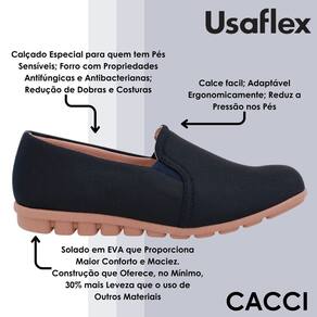 O calçado Usaflex é ideal para quem busca conforto e bem-estar em cada passo. Desenvolvido especialmente para pés sensíveis, ele conta com forro que possui propriedades antifúngicas e antibacterianas, garantindo higiene e proteção ao longo do dia. Sua estrutura foi pensada para reduzir dobras e costuras, evitando atritos e proporcionando uma sensação suave e agradável durante o uso.