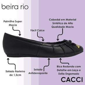 O grande destaque do modelo está no cabedal macio, com acabamento engomado que proporciona um visual estruturado e moderno. O bico redondo com laço delicado e aplicação metalizada completa o design com um charme sutil. A palmilha super macia garante bem-estar durante todo o uso, e o solado rasteiro com altura de um vírgula cinco centímetros proporciona estabilidade e aderência com o efeito antiderrapante.