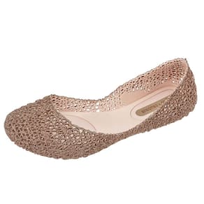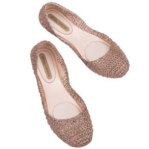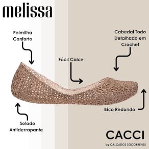 A Campana é uma sapatilha Melissa feminina delicada feita em parceria com os Irmãos Campana. Ela possui a estrutura clássica de uma sandália sapatilha e tem o seu grande diferencial a textura que forma seu cabedal, que é toda detalhada com crochet.