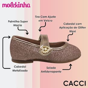 Com a Sapatilha Brilho da Molekinha, sua filha vai brilhar em qualquer lugar, com conforto e estilo em cada passo! Perfeita para festas ou momentos casuais, ela une modernidade e delicadeza para looks incríveis. Não perca a chance de levar essa beleza para casa!