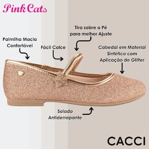 Os brilhos presentes em toda a superfície do modelo complementam o visual com um toque de sofisticação e elegância. Leve e prática, a sapatilha Pink Cats é fácil de calçar e combina com diversos looks, desde vestidos e saias até jeans e camiseta.