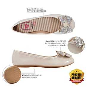 A Sapatilha Molekinha 2502390 tem o cabedal com tecido envernizado e laço super fofo com paetês, perfeita para deixar o look das meninas com muito brilho e charme. Palmilha plana de EVA revestida de tecido para o máximo de conforto. O solado é de material TR antiderrapante, garantindo mais segurança e estabilidade ao caminhar