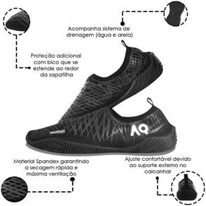 A Sapatilha aquática Multiesportiva foi feita para você surfar, mergulhar, usar em embarcações, Jet ski e caminhadas na praia. A Aqurun é confeccionada com tecnologia Spandex, um material sintético que se mantém justo ao pé para melhorar nos movimentos e com secagem rápida.