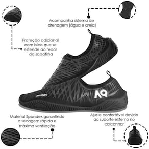 A Sapatilha aquática Multiesportiva foi feita para você surfar, mergulhar, usar em embarcações, Jet ski e caminhadas na praia. A Aqurun é confeccionada com tecnologia Spandex, um material sintético que se mantém justo ao pé para melhorar nos movimentos e com secagem rápida.