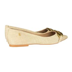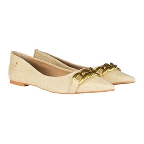 Sapatilha confeccionada em tecido copacabana. Traz bico fino e possui detalhes de correntes no cabedal, adicionando um toque sofisticado e elegante ao modelo.