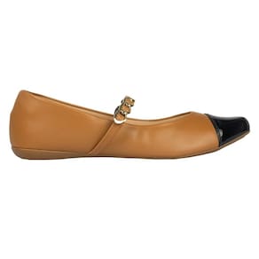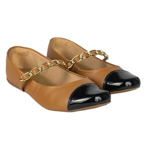 Sapatilha moderna e confortável. Com tira no peito do pé, estilo sapato boneca, com detalhes simulando uma corrente.