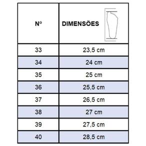 Recomendações de Uso: A limpeza do calçado pode ser feita com Detergente neutro e pano úmido. Não deixar submerso em água e não utilizar nenhuma forma de calor para secar. Guardar em local sem umidade.