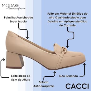 Feito em material sintético de alta qualidade, o sapato ainda se destaca pelo detalhe em aplique metálico no cabedal, que remete a uma corrente delicada e acrescenta um toque de sofisticação ao visual. Essa é a opção ideal para quem deseja unir beleza, conforto e praticidade em um único calçado, perfeito para mulheres que valorizam elegância sem abrir mão do conforto no dia a dia.