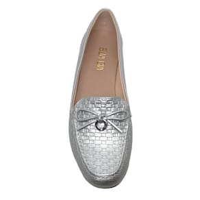 Com um acabamento metalizado e um delicado laço decorativo, este mocassim oferece um visual sofisticado e contemporâneo. Perfeito para adicionar um toque de brilho e elegância a qualquer look, seja com calças, saias ou vestidos.
