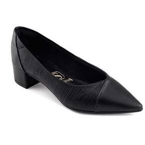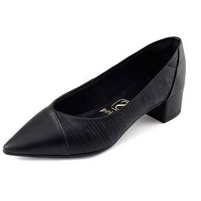 Produzido em material sintético de alta qualidade, possui design clássico com bico fino, acabamento texturizado e salto baixo bloco, proporcionando estabilidade e sofisticação.