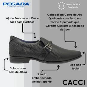 Os calçados Pegada são produzidos em couro, matéria prima de alta qualidade, que oferece maciez, resistência e muita durabilidade. Detalhes cuidadosamente elaborados, como costuras refinadas e acabamentos elegantes, fazem deste sapato uma escolha que se destaca. Ele não apenas complementa seu traje, mas também reflete sua atenção aos detalhes e seu gosto refinado.