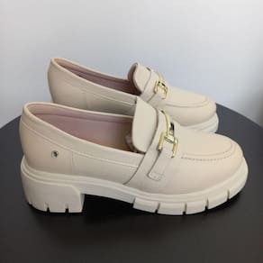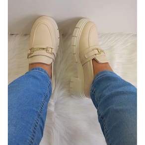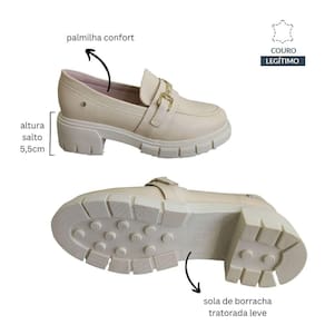 O Mocassim Feminino em Couro Off White QR Shoes, tem salto médio de 5,5cm, emborrachado, tratorado, além do bico redondo em seu cabedal ele traz costuras dando mais estilo e valor ao look, sola leve e possuí palmilha confort para maior conforto.