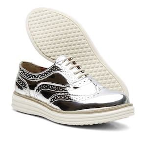 Sapato Oxford Feminino Metalizado Com Cadarço Casual Salto Baixo Palmilha EVA - Prata - 33