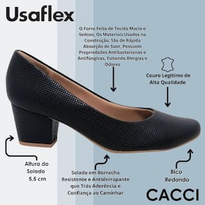 Scarpin Usaflex feito em napa valise com seu cabedal todo texturizado. O modelo possui tecnologia Bem-Estar e Hidratante, com espumas posicionadas em pontos estratégicos na palmilha garantindo conforto e suavidade na pisada e entrega uma agradável sensação ao toque e maciez através de microcápsulas de Aloe Vera. Seu salto bloco de 5,5 cm de altura com solado antiderrapante que trás aderência e confiança ao caminhar. Possui seu Bico arrebondado com forro acolchoado feito de material que reduz a propagação de fungos e bactérias, evitando odores e alergias.