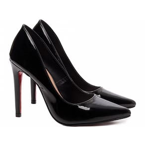 Material: Verniz Preto. Palmilha: 8 mm de Espessura, Espuma em EVA, Revestida em Verniz Preto e Taloneira Napa Bege. Salto: 12 cm de Altura Revestido em Verniz Preto. Solado de Micro na cor Vermelho.