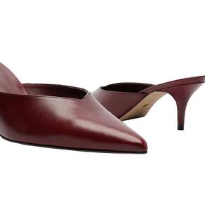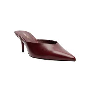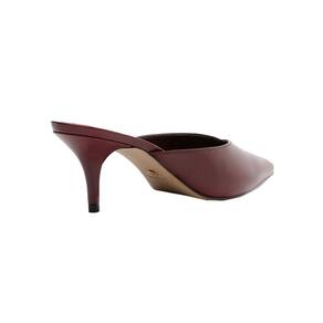 Scarpin Mule feminina marrom tem salto médio fino e ponta fina. Fechada, tem recorte em V no cabedal. Com palmilha da cor da mule e inscrição do nome da marca.