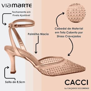 O scarpin feminino da Via Marte é um calçado que se destaca pela elegância. Com salto médio e bico fino, oferece um visual sofisticado. Seu design combina calcanhar aberto e frente fechada com material cravejado, criando uma aparência refinada. Tiras delicadas envolvem a parte exposta do pé, enquanto o fechamento prático na lateral garante um ajuste perfeito. Este modelo une estilo e conforto de maneira impecável.