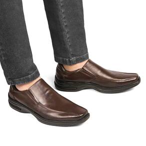 Sapato confeccionado em COURO NAPA, na cor PRETO e CAFÉ. Cabedal, apenas com costuras na napa, sem cadarço, fechamento no elástico, tecido cacharrel dublado com espuma, palmilha conforto com laminado P.U dublado com espuma utraleve de alta densidade e solado de borracha antiderrapante. A forma é um pouco mais larga com o bico mais alto para ter uma maior anatomia ao calçar