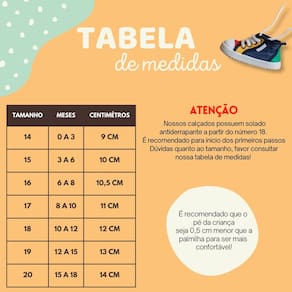 O sapatinho de bebê, foi desenvolvido para oferecer conforto para as crianças. Seus modelos são produzidos com materiais de alta qualidade, são macios e flexíveis. Possui um solado confeccionado em material macio e leve. É perfeito para passeios, festas e até mesmo para o dia a dia, garantindo conforto e estilo. OS TAMANHOS 14 AO 17 NÃO POSSUEM SOLA ANTIDERRAPANTE, POIS OS BEBES AINDA NÃO ESTÃO NA FASE DE ANDAR.OS TAMANHOS 18 AO 20 JÁ POSSUEM SOLA ANTIDERRAPANTE, POIS JÁ ENQUADRAM NO TAMANHO QUE AS CRIANÇAS ESTÃO DANDO OS PRIMEIROS PASSINHOS. TABELA DE TAMANHO 14 AO 20 N°14 = 0 - 3 MESES - 9CM N°15 = 3 - 6 MESES - 10CM N°16 = 6 - 8 MESES -10,5CM N°17 = 8 - 10 MESES - 11CM N°18 = 10 - 12 MESES - 12CM N°19 = 12 - 14 MESES - 13CM N°20 = 14 - 16 MESES - 14CM Cuidados: - Lavar manualmente - Não usar alvejante - Não usar secadora - Deixar secar naturalmente