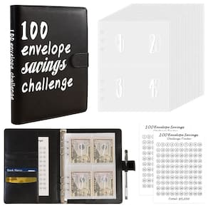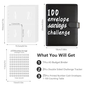 Pasta de poupança: desbloqueie o sucesso com nosso Desafio de Economia de Dinheiro de 100 Envelopes. O que você ganha: 1 fichário A5 de couro PU, 25 envelopes pré-impressos de 6 furos para dinheiro (1-100) e 2 rastreadores de dólares impressos em frente e verso (1-100) com compartimentos para cartões para facilitar a organização. Alcance suas metas de economia sem esforço com este conjunto abrangente de livros e fichários para economizar dinheiro.