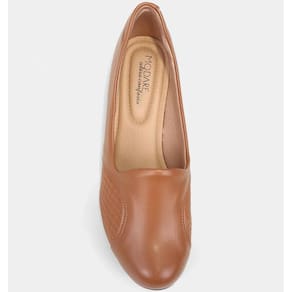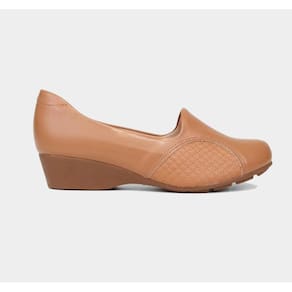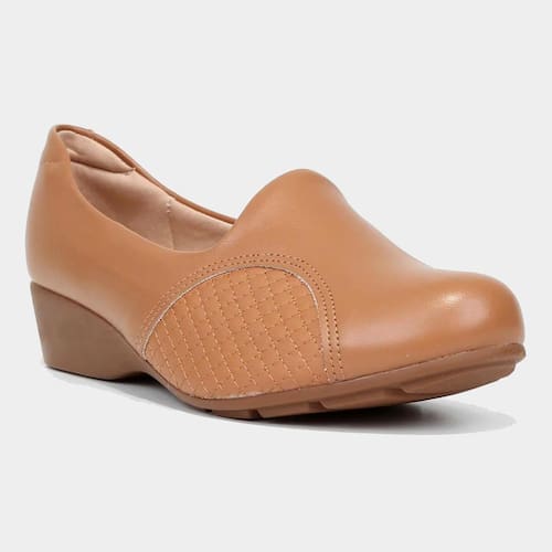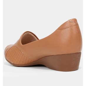 O scarpin Modare tem como diferencial o salto anabela e o cabedal flexível nas laterais, que promovem maior conforto para quem precisa de cuidados com o joanete.