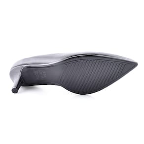 Scarpin fechado com salto médio, bico fino, em pelica preto, recorte arredondado no peito do pé e palmilha macia com aplicação da marca Godiva.