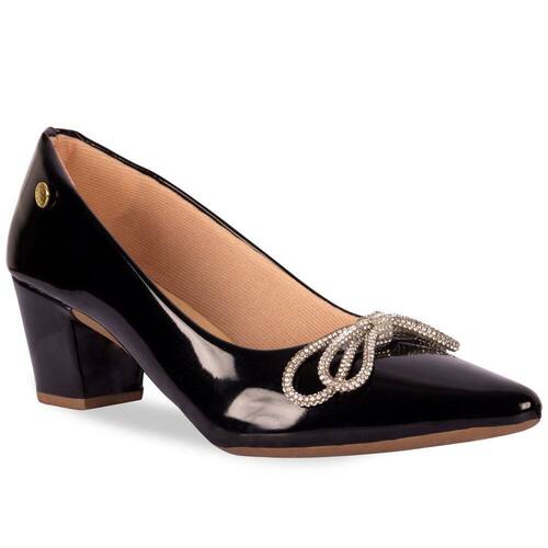 Scarpin Feminino Salto Grosso Verniz Laço Strass - 34 - Preto