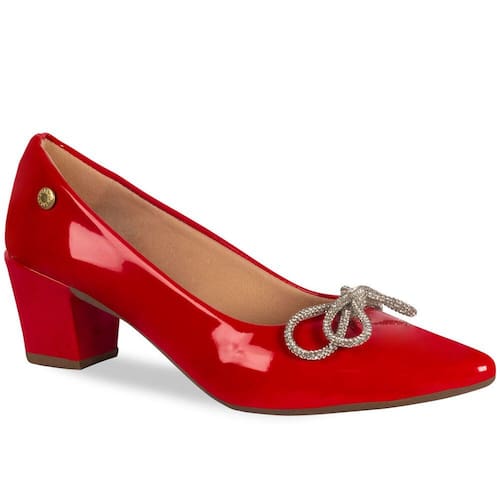 Scarpin Feminino Salto Grosso Verniz Laço Strass - 38 - Vermelho
