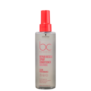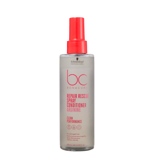 Condicionador em spray leave-in para cabelos danificados. Schwarzkopf Professional BC Bonacure Clean Performance Repair Rescue Spray Conditioner desembaraça instantaneamente e ajuda a restaurar a força e a elasticidade do cabelo sem sobrecarregar.