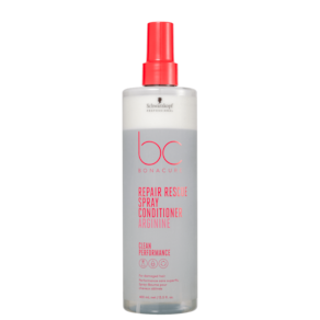 Condicionador em spray leave-in para cabelos danificados. Schwarzkopf Professional BC Bonacure Clean Performance Repair Rescue Spray Conditioner desembaraça instantaneamente e ajuda a restaurar a força e a elasticidade do cabelo sem sobrecarregar.