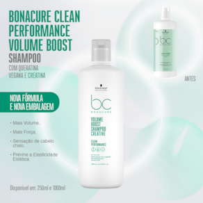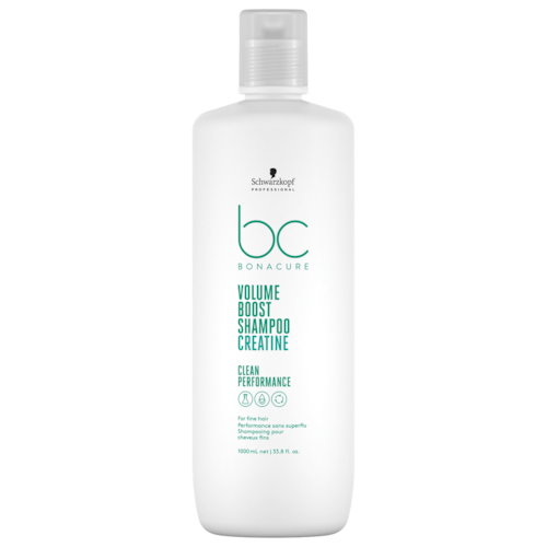 O Shampoo Schwarzkopf Professional BC Bonacure Clean Performance Volume Boost possui fórmula que não pesa o cabelo enquanto ajuda a prevenir o frizz em cabelos finos. A linha Volume Boost conta com Creatina que fornece maior volume com até 48 horas de sensação de cabelo mais cheio.