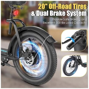 Projetada para conforto, a scooter possui um assento macio e respirável, ideal para viagens longas sem causar fadiga. Os pneus pneumáticos de 20 polegadas são robustos e absorvem bem os impactos, proporcionando uma condução confortável. O deck largo (9 x 17 polegadas) oferece espaço suficiente para os pés ou até mesmo para um animal de estimação.