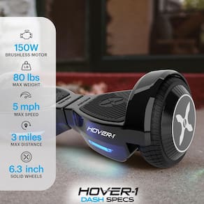 Hover-1 Hoverboard elétrico com autoequilíbrio Dash com velocidade máxima de 8 km/h, motores duplos de 75 W, pneus de 6,3 polegadas, alcance de 5 quilômetros e scooter de autoequilíbrio com luzes LED - Deslizamento sem esforço – Os motores duplos sem escovas de 75 W do nosso hoverboard resistente fornecem um total de 150 W de potência suave e confiável, impulsionando você até 8 km/h com facilidade. - Desempenho amigável para iniciantes – o sistema de estabilização dinâmica e as almofadas antiderrapantes garantem que você pedale com confiança. O veículo elétrico Dash com autoequilíbrio mantém o equilíbrio e o controle em todas as direções. - Luzes de LED para convés – As luzes LED da nossa scooter de equilíbrio Dash hoverboard adicionam estilo e visibilidade ao seu passeio. - Bateria de longa duração – A scooter Dash Hoverboard possui uma bateria recarregável de íons de lítio de 22,2 V/2Ah integrada que carrega totalmente em 5 horas. Pedale por até 5 km com uma carga completa. - Levamos a segurança a sério – Dash cria sinais de alerta se você estiver pedalando muito rápido ou em superfícies inseguras, permitindo que você diminua a velocidade e evite acidentes. O Dash também tem certificação UL2272, o que significa que atendeu aos padrões de testes abrangentes de segurança de dispositivos de mobilidade elétrica. Pedale com tranquilidade.