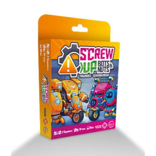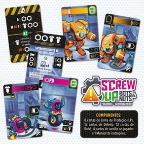 S’Crew Up: Bots & Nuts é um jogo estratégico de alocação de trabalhadores e “toma essa” para 2 a 4 jogadores, com apenas 37 cartas.