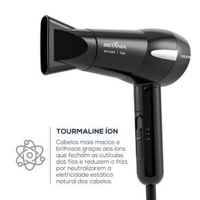Bivolt manual Potência de 1200W Íon Tourmaline APELO BENEFÍCIO Bivolt manual Perfeita para levar a qualquer lugar Íon Tourmaline Cabelos mais macios e brilhosos graças aos íons que fecham as cutículas dos fios e reduzem o frizz, por neutralizarem a eletricidade estática natural dos cabelos. Bocal concentrador Sua saída fina concentra e direciona o calor, facilitando a secagem e modelagem dos fios Cabo dobrável Facilidade de armazenamento e praticidade para levar em viagens 2 temperaturas e 2 velocidades Variedade de temperaturas e velocidades para diferentes tipos de cabelo. Cordão de 1,8m Maior liberdade de movimento