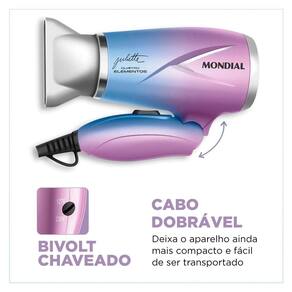 O secador qu4tro elementos colours tem design leve e compacto, além de cabo dobrável. Você dobra e encaixa seu aparelho na bolsa ou na mala com facilidade. Incrível, né Leve seu secador para qualquer lugar