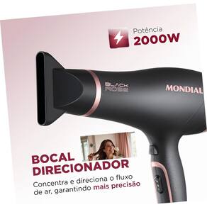 - **Nome do produto:** Secador de Cabelos Mondial SC-37 Black Rose- **Voltagem:** 110V ou 220V (não bivolt)- **Potência:** 2000W- **Tecnologia:** Tourmaline Íon- **Temperaturas:** 3 opções- **Velocidades:** 2 opções- **Material da grade:** Cerâmica- **Dimensões:** 9 x 22,5 x 29 cm- **Peso:** 540 g- **Marca:** Mondial- **Modelo:** SC-37- **Certificação:** BRA 18/01618- **EAN:** 7899882306989, 7898578152695