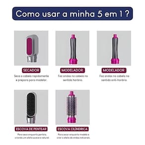 Secador de Cabelo 5 em 1 com Escova Modeladora 220v Kit 5 em 1 Secador Modelador Escova de Cabelo Alisadora ElétricaDescrição: Na correria do dia a dia, o que a gente mais precisa é de praticidade. E, na hora de cuidar dos cabelos, ter uma solução que seja prática e, ao mesmo tempo, entregue mais possibilidades com excelente resultado, é sonho de consumo. Esse Kit 5 em 1 é a inovação que chega para resolver o seu visual de um jeito muito fácil, sem você depender de ninguém. Ela é tão versátil que, sozinha, seca, desembaraça, alisa, disciplina e ainda modela seus cabelos, em poucos minutos e com apenas um movimento.