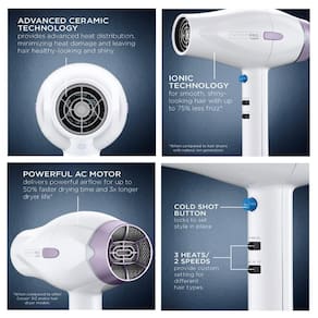 - Secagem sem frizz: apresenta tecnologia iônica para maior brilho e menos frizz; o potente motor AC oferece um tempo de secagem até 50% mais rápido e uma vida útil 3 vezes maior do secador de cabelo; inclui concentrador para modelagem precisa e difusor para melhorar os cachos e as ondas