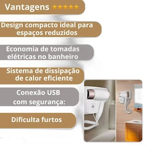 Secador de cabelo de parede usb branco 220v Descrição do anúncio: Adicione sofisticação ao seu banheiro com o secador de cabelo de parede, perfeito para uso em casa ou em ambientes como hotéis, pousadas e spas. Compacto, leve e poderoso, este secador iônico cuida da saúde do seu cabelo, proporcionando um brilho e suavidade excepcionais. Com seu design resistente e funcionalidade avançada, ele é ideal para qualquer tipo de cabelo, seja liso, encaracolado ou ondulado. Conteúdo da embalagem: 1 secador de cabelo de parede 1 cabo espiral de poliuretano extensível até 1,6 metros Manual de instruções Características: Design compacto: fácil de armazenar e ideal para viagens. Funcionalidade iônica: reduz o tempo de secagem e elimina o frizz, proporcionando brilho e suavidade ao cabelo. Resistência: feito para suportar quedas, compressão e altas temperaturas. Ventilação poderosa: baixo nível de ruído e excelente dissipação de calor. Especificações: Potência: 1300w Frequência: 50hz Comprimento do cabo de energia: 70cm Comprimento do cabo do secador: até 1,20m cabo espiral Configurações: 2 ajustes ar frio e quente Material: plástico resistente Cor: branco Dimensões: 24 x 17,5 x 17cm 2x entradas usb Principais perguntas sobre o produto e respostas: 1 este secador é adequado para uso doméstico Sim, ele é ideal tanto para uso doméstico quanto para ambientes comerciais como hotéis e spas. 2 o cabo do secador é resistente Sim, o cabo espiral de poliuretano é altamente resistente, com boa extensibilidade e rápida retração. 3 posso usar este secador em uma tomada comum Sim, ele é compatível com tomadas de 10a. 4 o secador é barulhento Não, ele possui uma ventilação poderosa com baixo nível de ruído. 5 este secador pode ser em cabelos molhados Sim, ele é projetado para secar rapidamente cabelos molhados, mantendo a umidade natural e evitando danos. Marca: Não Informado Ean: 7905276301338