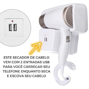 Secador de Cabelo Hotel 1000W com 2 USB Suporte Parede 110V Secador de cabelo parede hotel casa banheiro 1000W - 110V.