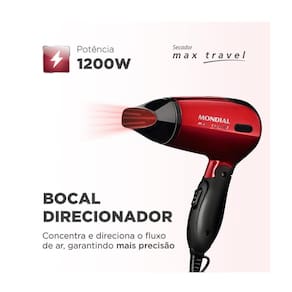 Secador de cabelo mondial max travel 1200w bivolt - sc-10potente e compacto: leve seu secador para onde quiser o secador max travel é a melhor opção para suas viagens. Por conta do cabo dobrável, cabe na bolsa ou mala com facilidade. Além disso, possui 1.200w de potência e proporciona uma secagem rápida.Características do produto:- portátil: cabo dobrável: o max travel tem design leve e compacto, além de cabo dobrável. Você dobra e encaixa seu aparelho na bolsa ou na mala com facilidade. Incrível, né Leve seu secador para qualquer lugar.- 1.200w: potência suficiente para deixar seu cabelo seco, modelado e lindo com rapidez e eficiência.- bivolt:: use seu secador de cabelo em qualquer tomada: 127v e 220v.- bocal direcionador de ar: o acessório concentra e direciona o fluxo de ar, proporcionando uma secagem mais precisa.- 2 velocidades + 2 temperaturas: escolha o que mais se adequa ao seu tipo de cabelo.- alça para pendurar: ajuda a pendurar o secador durante o uso e facilita o armazenamento.Especificações técnicas:modelo: sc-10voltagem: bivoltpotência: 1200wcor: preto/vermelhocontrole de velocidade: 2níveis de temperatura: 2comprimento do cabo: 1,50mgrade traseira removível: simjato de ar frio: simgarantia: 12 meses pelo fabricante