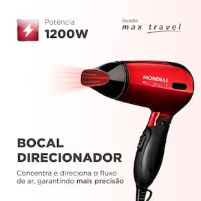 Está buscando por um secador de cabelo para levar prático e compacto? Vamos te apresentar o Secador de Cabelo Mondial Max Travel. Perfeito para levar na mala ou bolsa, o secador Mondial conta com cabo dobrável, fica mais fácil de ser transportado. Seus 1200W de potência deixa o seu cabelo seco, modelado e lindo com rapidez e eficiência. Além de ser dobrável, o secador é bivolt. Conta com acessório direcionador de ar, para uma secagem mais precisa e rápida. Suas 2 velocidades e 2 temperaturas vão te ajudar a encontrar sempre o ajuste ideal para os seus fios.